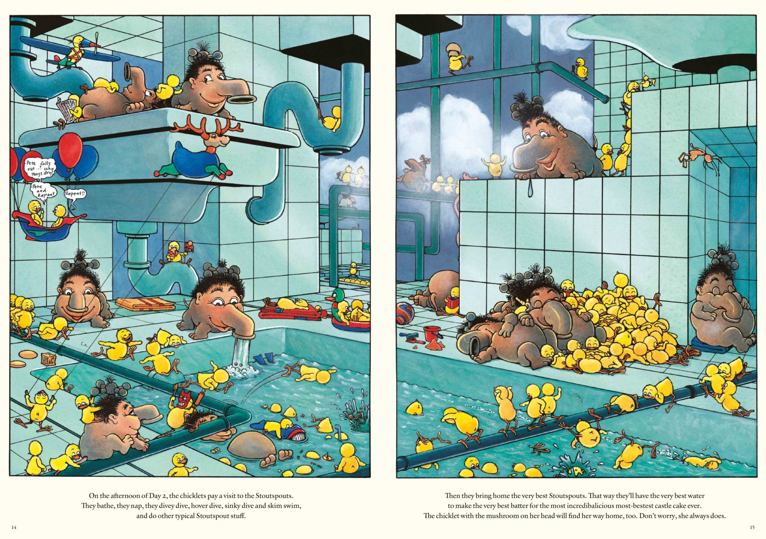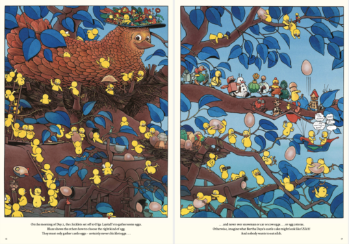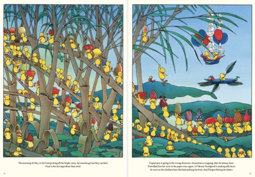 A rabble of soft, golden “chicklets” are awoken one morning to a startling proclamation: they only have ten short days to prepare for their best friend Bertha Daye’s party. It’s time to get to work building a larger-than-life castle cake to house and feed the revelers. Made of chocolate scooped out of chocolate mines, “finer than fairy dust” flour from the hillsides, and fruit carried down twigs and stems in the forest, this will be the best—and kookiest—cake of all time. Oodles of chicklets fill every page, scurrying, fluttering, napping, tumbling, helping, and getting up to no good. When the party day arrives, guests pour into the pastry palace, many of them unmistakable characters from iconic stories’ past, offering a marvelous who’s-who of story-book history. Claude Ponti’s nimble wordplay and punning, combined with his phantasmagorical illustrations, create an endearing gem of a book, bound to be a bedtime story favorite.