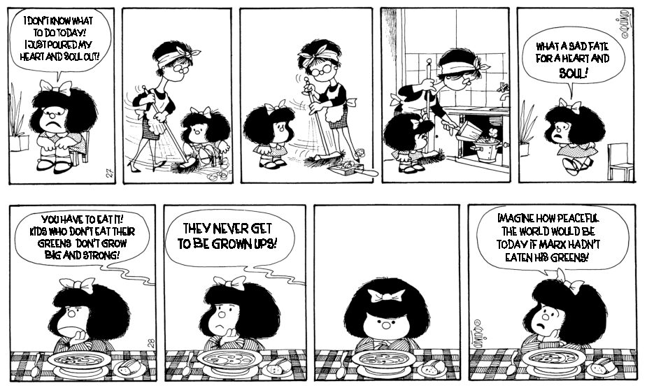 Six-year-old Mafalda loves democracy and hates soup. What democratic sector do cats fall into? she asks, then unfurls a toilet paper red carpet and gives her very own presidential address. Mafalda’s precociousness and passion stump all grown-ups around her. Dissident and rebellious, she refuses to abandon the world to her parents’ generation, who seem so lost.